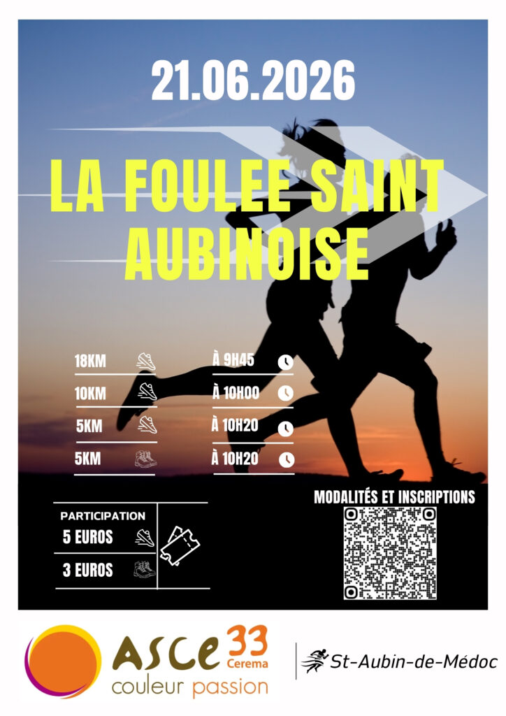 L’ASC vous propose de participer à la Foulée Saint-Aubinoise à Saint-Aubin-de-Médoc le dimanche 21 Juin.